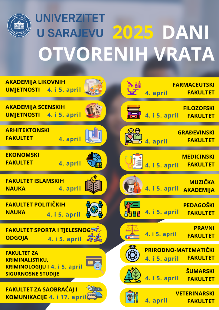 Poštovane, poštovani, Obavještavamo vas da je najava događaja „Dani otvorenih vrata Univerziteta u Sarajevu“ objavljena na web stranici Univerziteta i dostupna na sljedećem linku: https://www.unsa.ba/novosti/dani-otvorenih-vrata-univerziteta-u-sarajevu