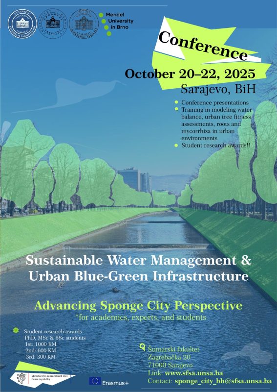 Organized by the Faculty of Forestry, University of Sarajevo, the Faculty of Civil Engineering, University of Sarajevo, and Mendel University in Brno, this event will bring together leading experts, researchers, practitioners, and students to address one of the most pressing challenges of our time—ensuring sustainable management of water resources in rapidly urbanizing environments.