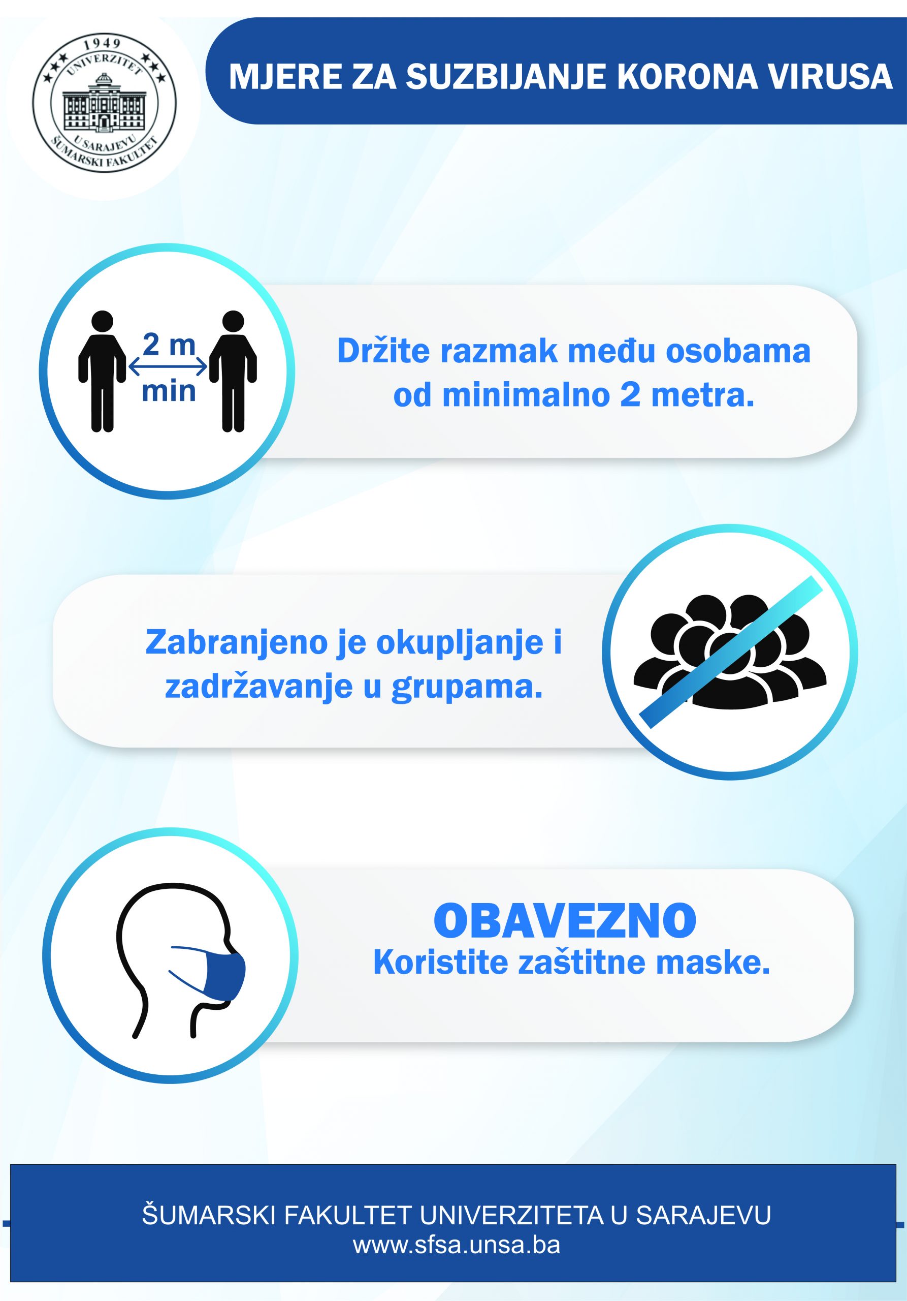 Odluku o izmijenjenom načinu rada na Šumarskom fakultetu, kao i uputstva za postupanje u slučaju zaraze COVID-19, te dodatna obavezujuća uputstva i preporuke možete preuzeti na linkovima ispod: