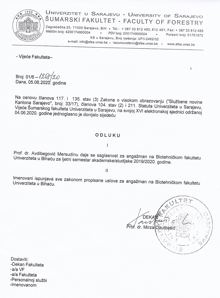 Prof. dr. Mersudinu Avdibegoviću daje se saglasnost za angažman na Biotehničkom fakultetu, Univerziteta u Bihaću, po odluci Vijeća Šumarskog fakulteta Univerziteta u Sarajevu